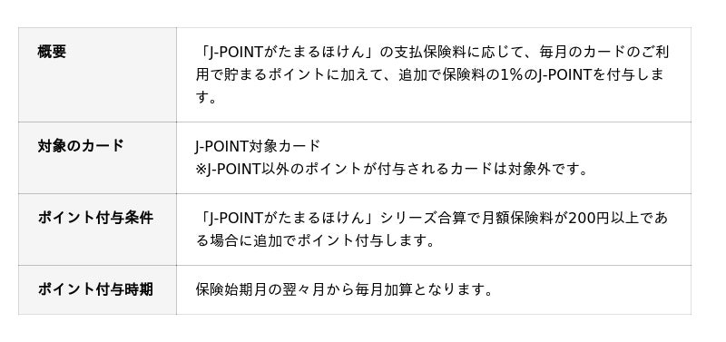 J-POINT対象カードをお持ちの会員様を対象に、月額100円から申し込み可能な「J-POINTがたまるほけん」を提供します。会員様専用のサイト「JCBのほけん」を通じて、簡単に申し込み可能です。「J-POINTがたまるほけん」は、本商品の保険料支払に応じて、通常のご利用で貯まるJ-POINTに加えて、“さらに”J-POINTが1%貯まることが特徴です。