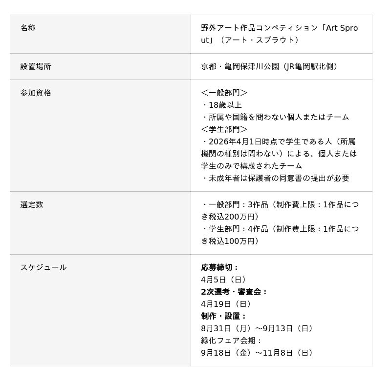 京都府亀岡市(亀岡市長 桂川孝裕)は、かめおか霧の芸術祭実行委員会(委員長:亀岡市副市長 佐々木京子)と連携し、今年秋に開催される国内最大規模の花と緑の祭典「全国都市緑化フェアin京都丹波(以下、緑化フェア)」を契機に、会場となる京都・亀岡保津川公園の魅力を引き立てる野外アート作品のデザインおよび制作を担うアーティストを2026年2月9日より公募しています。本コンペティションでは、地域に住む人々の暮らしを支えてきた環境や記憶、あるいは日常の中で見過ごされてきた価値や問いを独自の感性で表現する「アート作品」を募集します。一般部門3作品、学生部門4作品の計7作品を募集し、選出されたアーティストには制作費(一般部門:上限200万円、学生部門:100万円)が支給され、作品は京都・亀岡保津川公園会場に展示される予定です。
