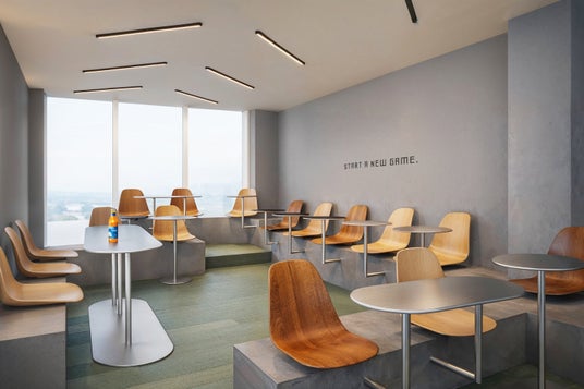 店内にはスタジアムの観客席を想起させる段床(だんしょう)を採用。