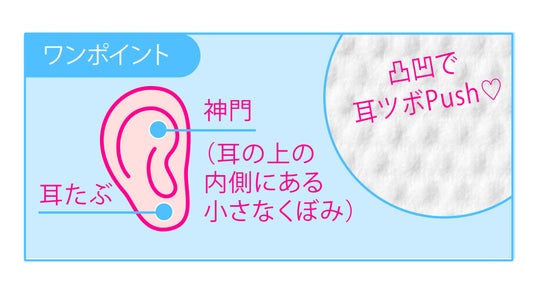 パッドの凸凹で耳ツボPush!神経の興奮を鎮め、不安感を和らげると言われている「神門」というツボや、「耳たぶ」をつまんでほぐすと効果的です。