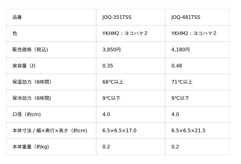 『真空断熱ケータイマグ(JOQ-351TSS YKHM2/JOQ-481TSS YKHM2)』 仕様一覧
