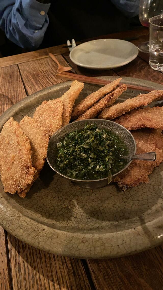 07放牧豚のカツレツ(からりと揚がった薄口カツにハーブソース。カツなのにとてもサラッとしている)