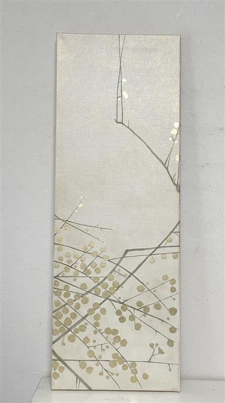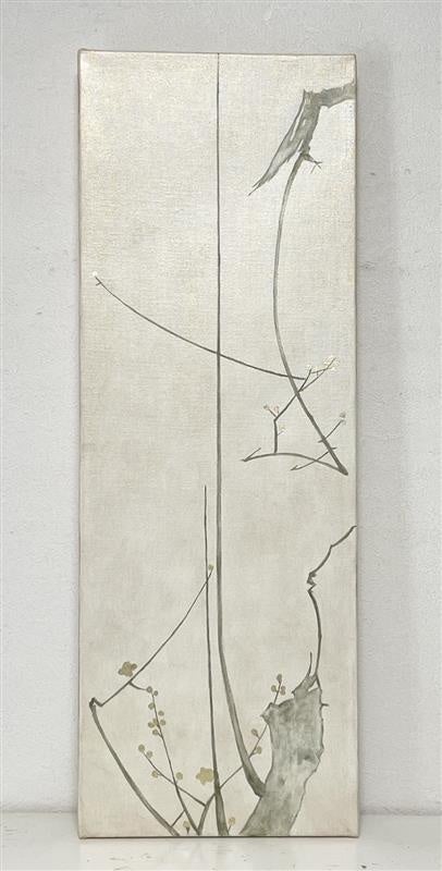 江戸時代の水墨画からインスピレーションを得て、縦 に枝の伸びた白梅図を2枚描きました。キャンバスに 箔、油彩になります。