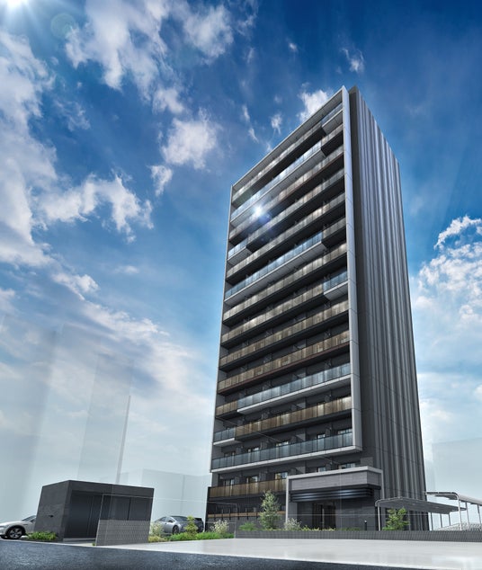外観は、都会的で洗練された印象を与えるモダンデザイン。縦のラインを強調したフォルムとガラスバルコニーが、軽やかで現代的な都市建築の表情を描きます。