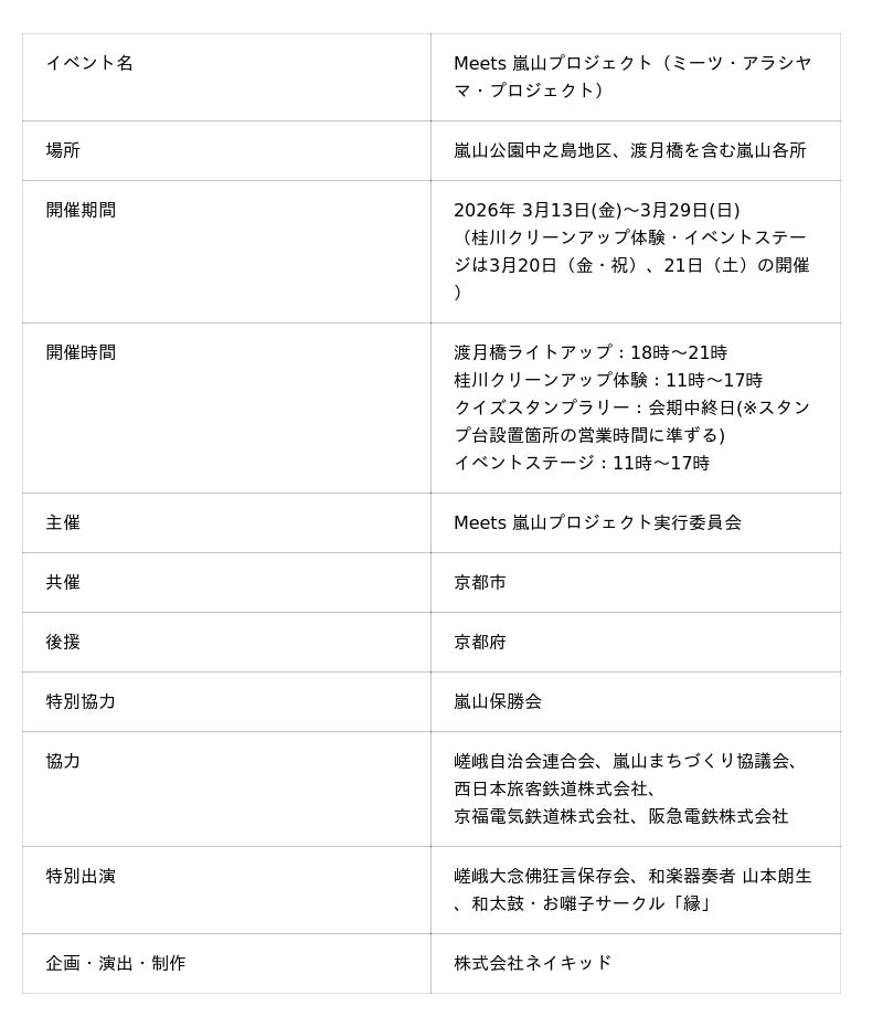 株式会社ネイキッド(英語表記:NAKED, INC. 、所在地:東京都渋谷区、代表:村松亮太郎)は、京都・嵐山において、マスツーリズム対策を見据えた持続可能な観光の仕組みづくりとして、観光・環境・文化をつなぐ体験型プロジェクト「Meets 嵐山プロジェクト」を始動します。2026年3月13日(金)~3月29日(日)に、渡月橋ライトアップをはじめとする施策を実施します。