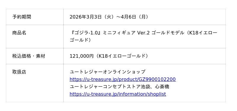 株式会社ユートレジャー(本社:東京都新宿区、代表取締役社長:青木 興一、株式会社ケイ・ウノの連結子会社)は、東宝株式会社とコラボレーションした「『ゴジラ-1.0』ミニフィギュア ゴールドモデル」の予約受付を2026年3月3日(火)~4月6日(月)の期間限定で予約受付を行います。100体の数量限定です。
