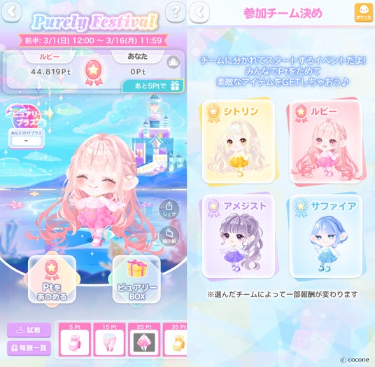 3月1日(日)からはチームに分かれてアイテムを集めるイベント「Purely Festival」がスタート。4つのチームの中から好きなチームを1つ選んで参加し、同じチームのメンバーと協力して「Pt」を貯めることで各チームをイメージした特別なアイテムが手に入ります。