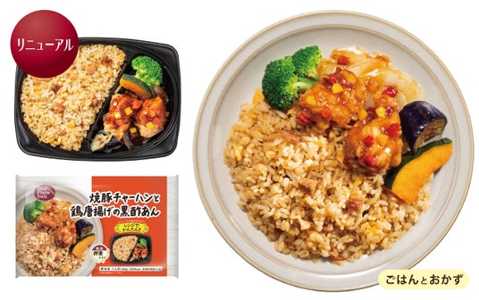 ねぎ油の風味が香る焼豚チャーハンと、黒酢あんをからめた唐揚げが食欲をそそります。
