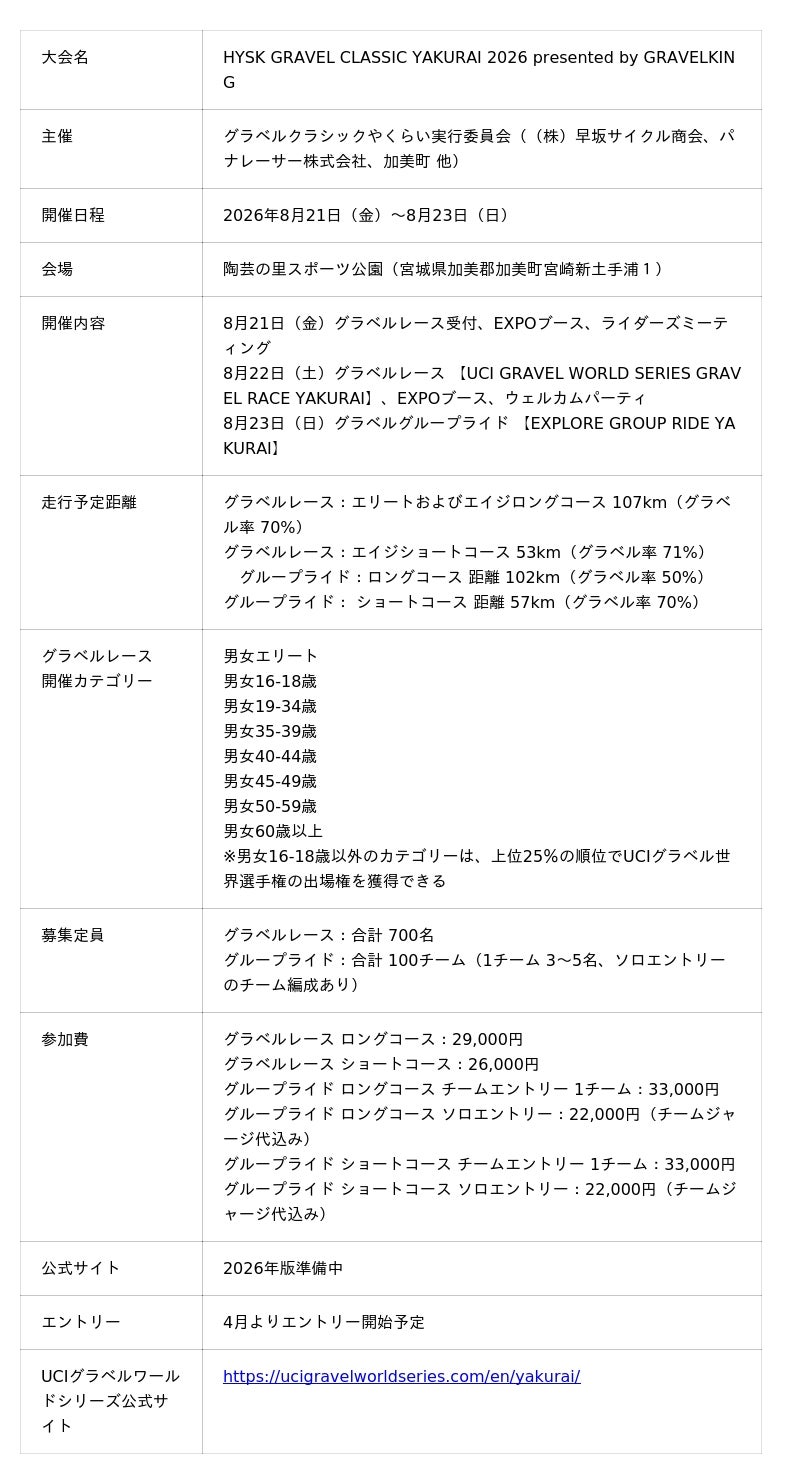 この度、弊社は株式会社早坂サイクル商会様とともに、UCIグラベルワールドシリーズの一戦である「HYSK Gravel Classic Yakurai presented by GRAVELKING」のオーガナイザーを務めさせていただくことになりました。