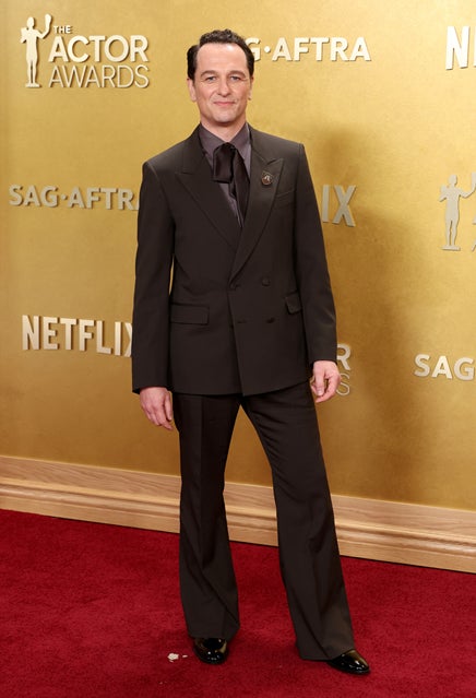 マシュー・リスは、ブラウンのダブルブレストタキシードに、シルクのドレスシャツ、シルクタイ、ブラックのパテントレザー オックスフォードシューズと、ブローチをコーディネートしました。