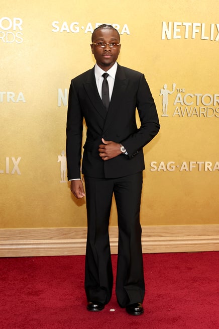 マイルズ・ケイトンは、ブラックのダブルブレストタキシードに、ホワイトのドレスシャツ、ブラックのネクタイ、ブラックのダービーシューズをコーディネートしました。