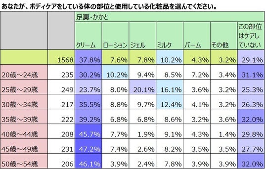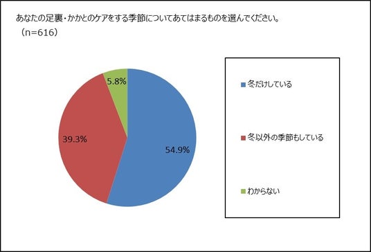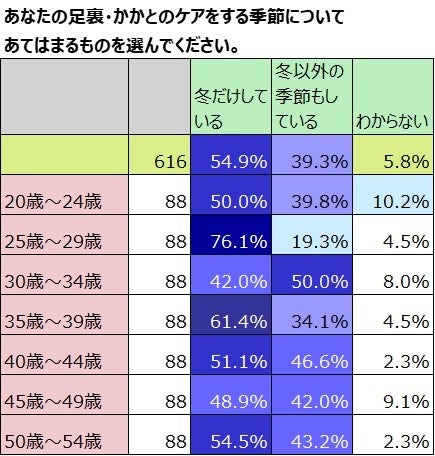 足裏・かかとのケアをしている季節についてききました。全体では「冬だけしている」のは54.9%、「冬以外の季節もしている」が39.3%でした。年齢ごとに見てみると、「冬だけしている」のがいちばん多いのは20代後半で76.1%でした。「冬以外の季節もしている」が最も多いのは30代前半で、50%でした。足裏の悩みが深まる40代以上になると4割以上の女性が冬以外の季節もケアしていることがわかりました。