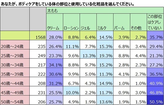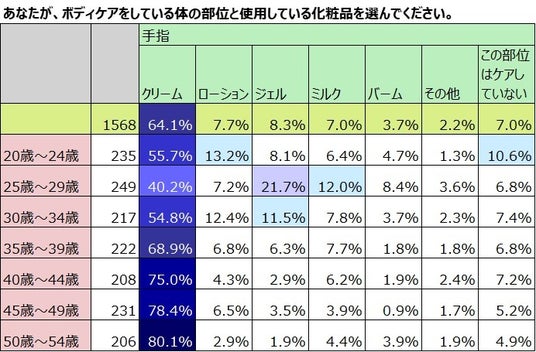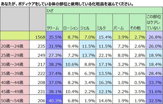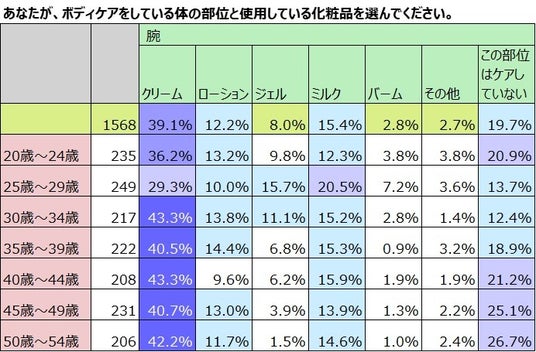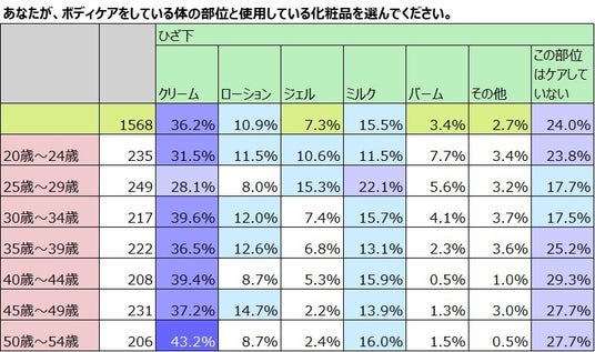 最も頻度が高いのは「クリーム」を使用したボディケアをしている女性。多