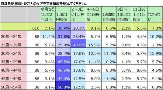足裏・かかとのケアの頻度について聞きました。全体では「1日に1回」が最も多く39.4%です。「朝晩など1日に2回以上」の7.1%と合わせて46.5%の約5割が1日に1回以上ケアしています。「1日に1回程度」が最も多いのは50代前半で56.8%と6割近い割合です。若年層の方がケアをしている頻度は少なく、20代後半は「2~3日に1回」が最も多く40.9%でした。20代前半も「2~3日に1回」は28.4%でした。