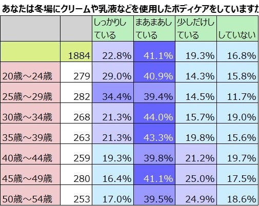 次に冬場にクリームや乳液などの化粧品を使用したボディケアをしているか否か聞きました。全体では「しっかりしている」22.8%と「まあまあしている」41.1%を合わせた63.9%の女性がボディケアをしていると答えました。