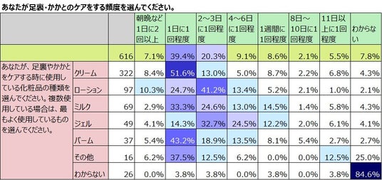 次に使用しているアイテムと、足裏のケアの頻度をかけ合わせてみてみました。油分の多い「クリーム」や「バーム」は1日に1回程度のケアが多く、「クリーム」で51.6%、「バーム」で43.2%です。水分の多い「ローション」は「朝晩など1日に2回以上」の割合が10.3%と高い一方、「2~3日に1回程度」が最も多く、41.2%でした。同じく水分の多い「ジェル」も最も多い頻度は「2~3日に1回程度」で32.7%、その次が「4~6日に1回」で24.5%でした。3.の分析で見られるように、「ジェル」や「ローション」は比較的、効果の満足度が高く、かつケアの頻度もクリームやバームに比べて低いことがわかりました。