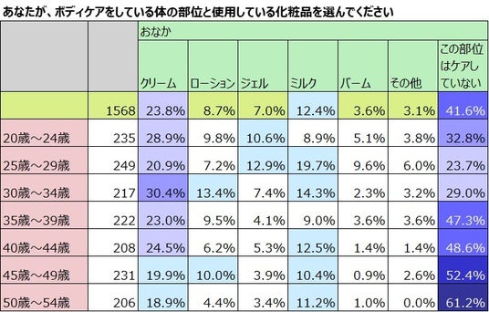 年齢が上がるほど悩みは増えるが、ボディケアしている割合は少なくなる傾向。