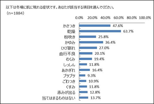 全国の20歳~54歳の女性1,884名にインターネットで冬場に肌に現れる症状について聞きました。(複数選択)1位は「乾燥」で63.7%、2位は「かさつき」で47.6%、3位は「かゆみ」で36.4%でした。「当てはまるものはない」は13.7%であったため、86.3%の女性が何らかの症状に悩んでいることがわかります。