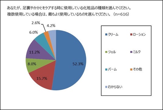 全国の20歳~54歳の1,884名の女性のうち、冬場の足裏・かかとのガサガサに悩んでいて何らかのケアをしていると答えた616名に聞きました。足裏・かかとのケアのために使用しているアイテムは、1位「クリーム」52.3%、2位「ローション」15.7%、3位「ミルク」11.2%でした。(複数のアイテムを使用している人には、最もよく使用しているアイテムを選んでいただきました。)2.のボディケアをしている部位の調査では、1位「クリーム」、2位「ミルク」、3位「ジェル」でしたので、悩んでいる女性と単にケアをしている女性では使用しているアイテムに違いがあることがわかりました。