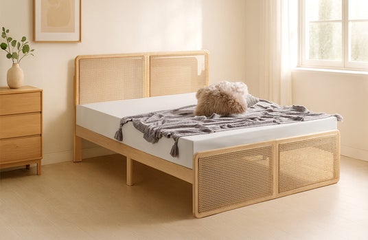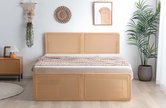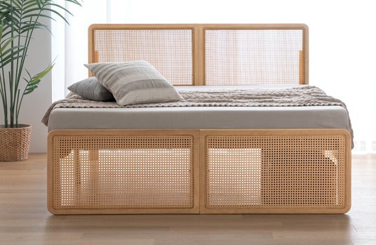 ヘッドボードとフットボードにラタン調デザインを採用しており、ラタンならではの美しい編み目を贅沢に楽しめるベッドフレームとなっています。自然な風合いでお部屋に馴染みながらも、編み目が作る立体感が寝室にほどよいアクセントを与えてくれます。
