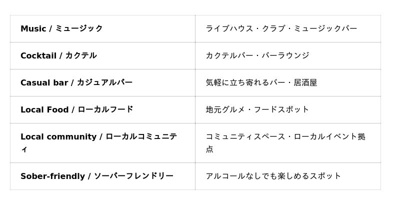 Music・Cocktail・Casual bar・Local Food・Local community・Sober-friendlyの6カテゴリーで店舗をアイコン表示し、初来街者から地元通まで誰でも活用できます。