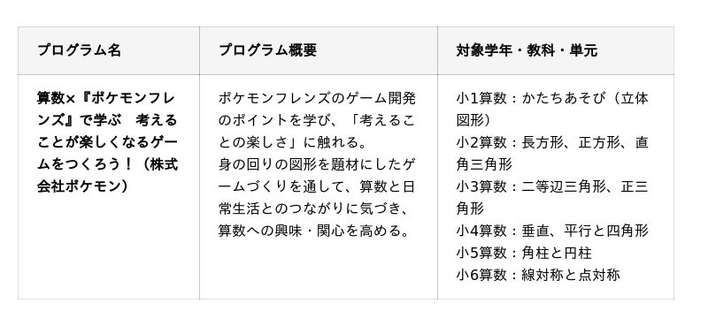 今回はその第10弾として、株式会社ポケモンの『ポケモンフレンズ』と連携した「算数×『ポケモンフレンズ』で学ぶ 考えることが楽しくなるゲームをつくろう!」を提供いたします。なお、本プログラムは、2月27日に公開いたしました小・中学校向け探究学習ライブラリー「SPARKE(スパーク)」よりご利用いただけます。