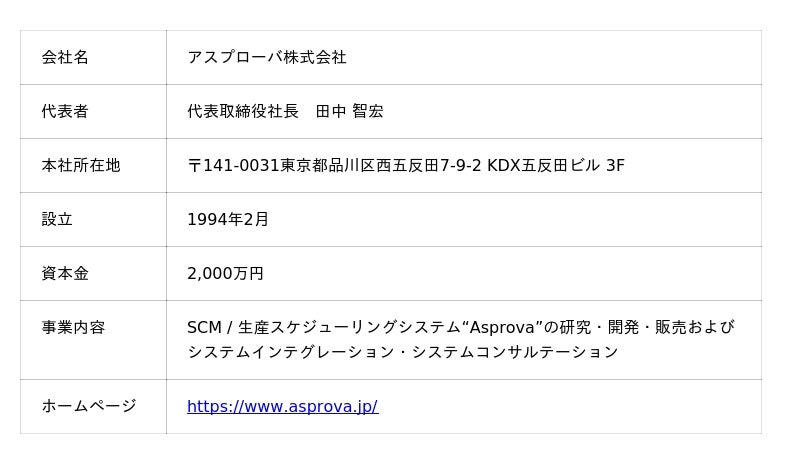 Asprovaは、1994年にアスプローバ社が開発した生産スケジューラです。多品種多工程の生産計画を超高速に作成し、工場の各設備や人員のスケジュールを秒単位の精度で作成し、実行可能な作業指示を計算してガントチャートで出力します。発売以来、国内外の幅広い製造業で採用され、順調に導入・利用社数を拡大しています。今後も生産スケジューリングのデジタライゼーションを支えるプラットフォームとして、機能とサービスの拡充を図ってまいります。(https://www.asprova.jp/products/overview.html)