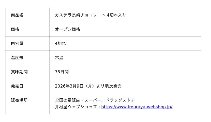 井村屋株式会社(本社:三重県津市高茶屋七丁目1番1号、社長:岩本 康)は、コクのあるチョコレートとカステラの味わいが調和した『カステラ長崎チョコレート 4切れ入り』を、2026年3月9日(月)から全国で順次発売します。