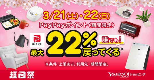 LINEヤフー株式会社(以下、LINEヤフー)が運営する「Yahoo!ショッピング」は、2026年3月3日(火)正午から22日(日)まで、年度末の買い物をおトクに楽しめる大型キャンペーン「超PayPay祭(ちょうペイペイまつり)」(以下、本施策)を開催します。本施策は、PayPay株式会社、PayPayカード株式会社、およびLINEヤフー株式会社が、本日から実施している店舗やオンラインストアなどで「PayPay」「PayPayカード」を利用すると、お得に食事や買い物ができる大規模キャンペーン「超PayPay祭」(※1)の一環として開催します。