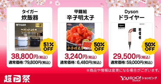 - 内容:タイガーの炊飯器や甲羅組の辛子明太子、Dysonのドライヤーなど、家電や食品をはじめとする「超PayPay祭」特別商品を販売予定です。半額以下で購入できる商品もあり、3月16日(月)正午より、一部商品を事前に公開予定です。