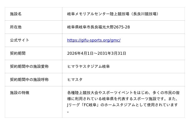 株式会社ヒマラヤ(社長:小田 学、本社:岐阜県岐阜市)は岐阜県と、同県が所有する岐阜メモリアルセンター陸上競技場(長良川競技場)の施設命名権契約を締結し、ネーミングライツ・パートナーとなりました。2026年4月1日(水)から2031年3月31日(月)までの5年間、同施設の愛称は「ヒマラヤスタジアム岐阜(呼称:ヒマスタ)」となります。