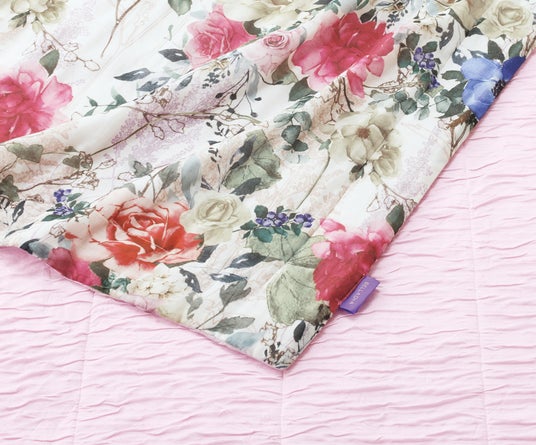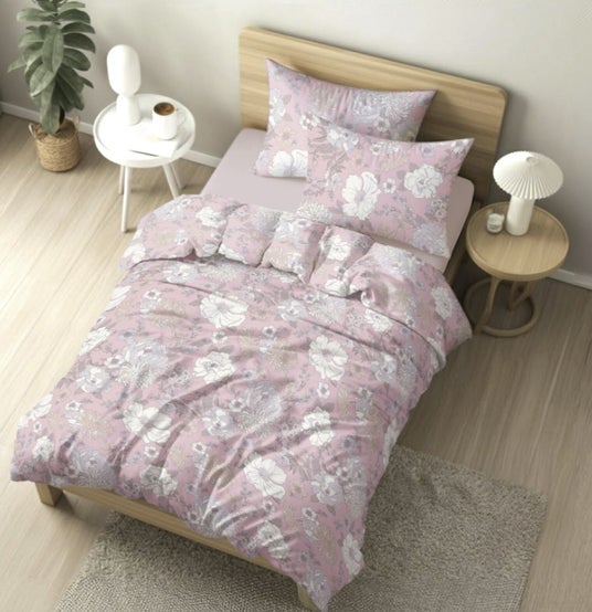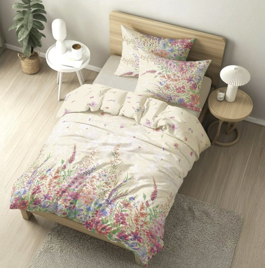 咲き誇る花園を水彩画のようなソフトなタッチで表現。サテン生地の滑らかな光沢がベッドルームを華やかに彩ります。