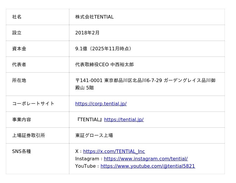 株式会社TENTIALは、「健康に前向きな社会を創り、人類のポテンシャルを引き出す。」をミッションに掲げ、コンディショニングブランド『TENTIAL』を運営しています 。代表取締役CEO中西裕太郎は、プロサッカー選手を目指した高校時代に病気で夢を絶たれた原体験から、自身のポテンシャルを最大限に発揮するためには健康と日々のコンディショニングが不可欠であると痛感。この経験から株式会社TENTIALを創業し、世の中に「コンディショニングを実装する」ことを目指しています。コンディショニングブランド『TENTIAL』は、アスリートの知見と最新技術・研究に基づき、機能性を追求した製品・サービスを提供。24時間365日、日常生活のあらゆるシーンで心身を整え、疲労回復やパフォーマンス向上をサポートするコンディショニング活動を推進しています 。すべては個人のコンディションとポテンシャルを引き出すという信念のもと、株式会社TENTIALは、健康に前向きな社会の実現のため、コンディショニングの社会実装に取り組んでまいります。