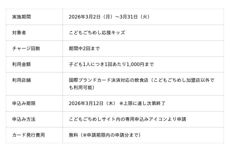 地域の飲食店をこども食堂化するサービス「こどもごちめし」を運営するNPO法人Kids Future Passport(読み:キッズ・フューチャー・パスポート/代表理事:中本真理子/所在地:福岡県福岡市博多区、以下KFP)は、公益財団法人JKAの補助金を活用し、Gigi株式会社(本社:東京都港区、代表取締役 今井了介、以下Gigi)および株式会社Kort Valuta(本社:東京都渋谷区、代表取締役 柴田 秀樹、以下Kort Valuta)3社連携のもと、要支援世帯向けに、Visaカード決済対応の飲食店で利用可能な「食事支援カード」の実証実験を、2026年3月2日(月)から3月31日(火)まで実施いたします。本カードの導入により、従来はこどもごちめし加盟店に限られていた利用店舗の制約を拡張し、Visaカード決済対応飲食店であれば利用可能となります。