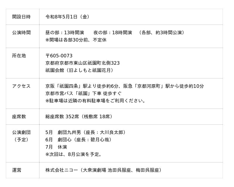 大衆演劇場「旅芝居の名門 呉服座」を運営する株式会社ニコー(本社:大阪市北区、代表取締役社長:山崎理史)は、令和8年5月、京都・祇園会館にて新劇場「祇園呉服座」を開設いたします。総座席数は352席を備え、伝統と華やかさが融合した全国屈指の規模を誇る劇場となります。