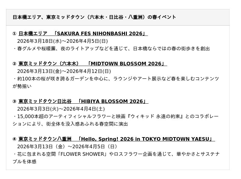 本日3月3日(火)より、東京ミッドタウン日比谷「HIBIYA BLOSSOM 2026」を皮切りに、3月13日(金)からは東京ミッドタウン(六本木)と東京ミッドタウン八重洲が、さらに3月18日(水)からは、日本橋エリアにて、各エリアの特性を活かした春のコンテンツを展開いたします。