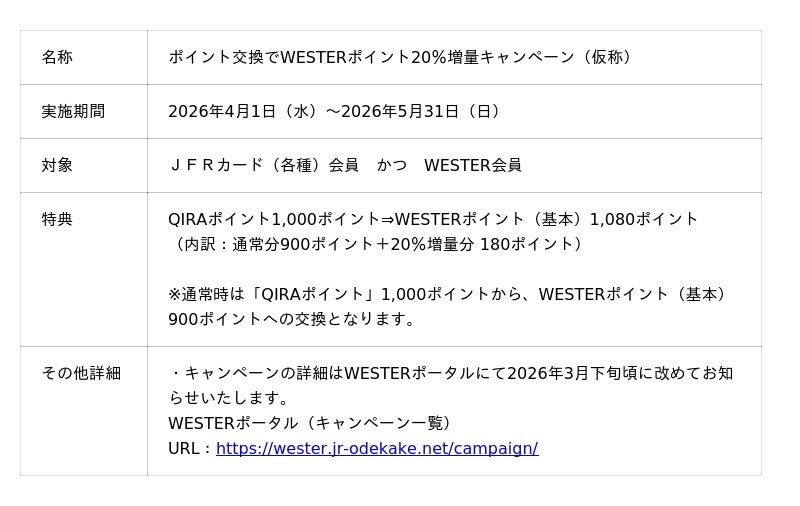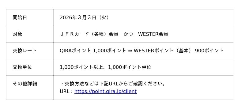 西日本旅客鉄道株式会社(本社:大阪府大阪市、代表取締役社長:倉坂昇治、以下「JR西日本」)は、JFRカード株式会社(本社:大阪府高槻市、代表取締役社長:大木淳史、以下「JFRカード」)が提供する「QIRAポイント」から「WESTERポイント」への交換サービスを2026年3月3日(火)より開始いたします。