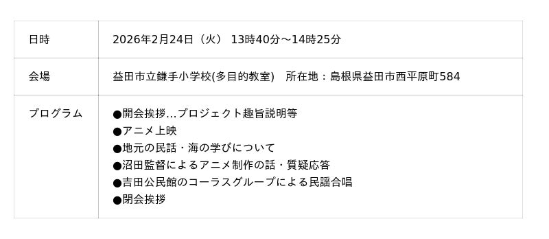 一般社団法人日本昔ばなし協会が取り組む「海ノ民話のまちプロジェクト」は、2026年2月24日(火)に島根県益田市を舞台にした海ノ民話アニメーション「高島のおイセさん」が完成したため、アニメ監督が益田市を訪問しアニメのお披露目と「海ノ民話のまち」認定式を実施しました。また、同日午後には、鎌手小学校で同作品の上映会イベントを開催しました。