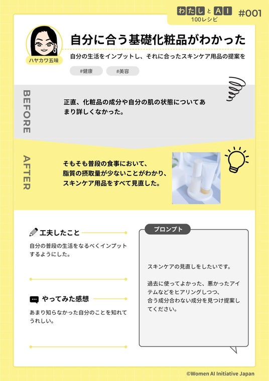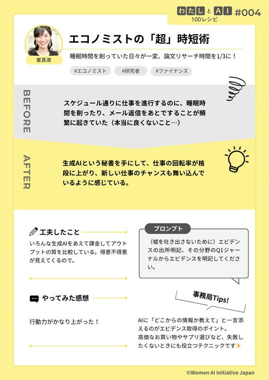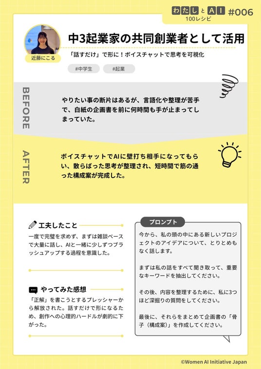 一般社団法人Women AI Initiative Japan(所在地:東京都渋谷区、代表理事:國本 知里、以下、WAIJ)は、3月8日(日)の国際女性デーにあわせ、100名の女性による生成AI活用事例集『#わたしとAI 100レシピ』を公開予定です。