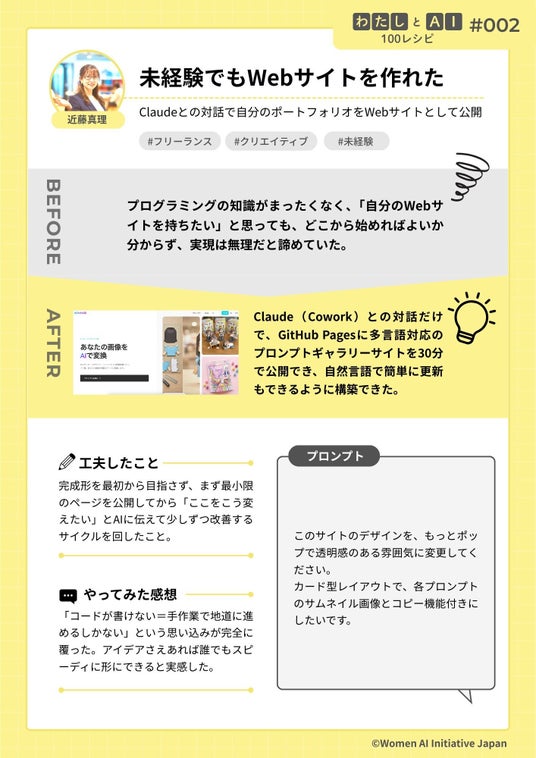『#わたしとAI 100レシピ』には、現在、以下のような生成AI活用事例が寄せられています。- プログラミング未経験から、AIとの対話だけでWebサイトを公開