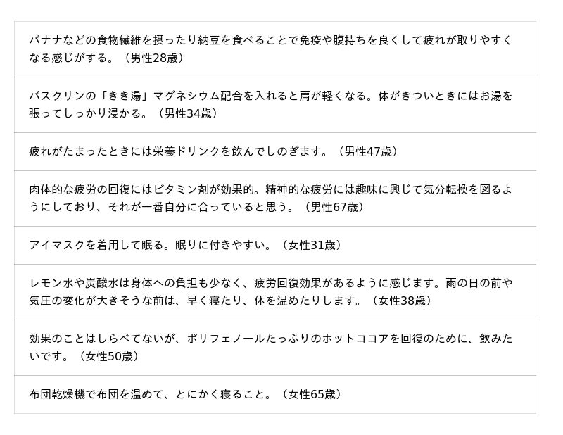 疲労を感じる状況や原因、自由記述にて疲労回復方法や事前対策などについて聞いています。調査結果をお知らせいたします。