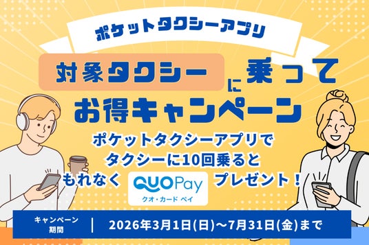 ◇期間:2026年3月1日(日)~7月31日(金)まで。◇ポケットタクシーアプリを使ったタクシー乗車10回ごとにQUOカードPay500円分をプレゼント。