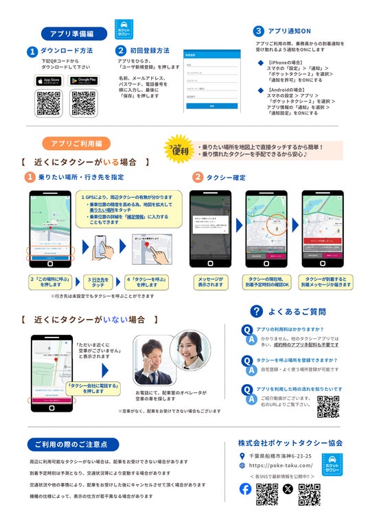 また、通常お電話でタクシーを呼ばれるお客様を、ポケットタクシーアプリに誘導することにより、配車室の人的負担やコスト軽減にも寄与いたします。
