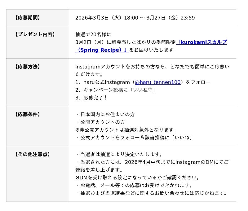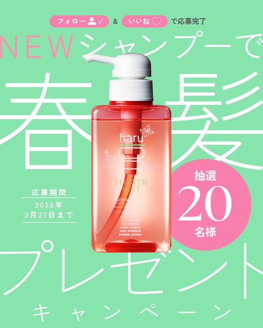 ヘッドビューティブランド「haru」(株式会社nijito/本社:東京都港区、EC事業部:福岡市中央区)では、3月3日(火)18時よりこの春の新商品【季節限定】kurokamiスカルプ(Spring Recipe)が当たるプレゼントキャンペーンを公式Instagramで開催いたします。公式アカウント(@haru_tennen100)をフォロー&いいねをいただいた方の中から抽選で20名様にお届けいたします。是非、この春の特別なアイテムをお楽しみください。