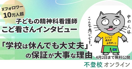 こうした中、不登校のお子さんがいる親御さんのためのウェブメディア「不登校オンライン」(運営:株式会社キズキ)は、児童精神科看護師・こど看さんにインタビューを実施しました。テーマは「不登校のお子さんを支える親御さんへのアドバイス」です。