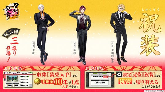 「祝装」は刀剣男士ごとに甲州金10朱での購入または、「祝装仕立券(しゅくそうしたてけん)」1枚との交換にて入手が可能です。