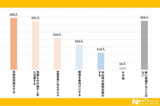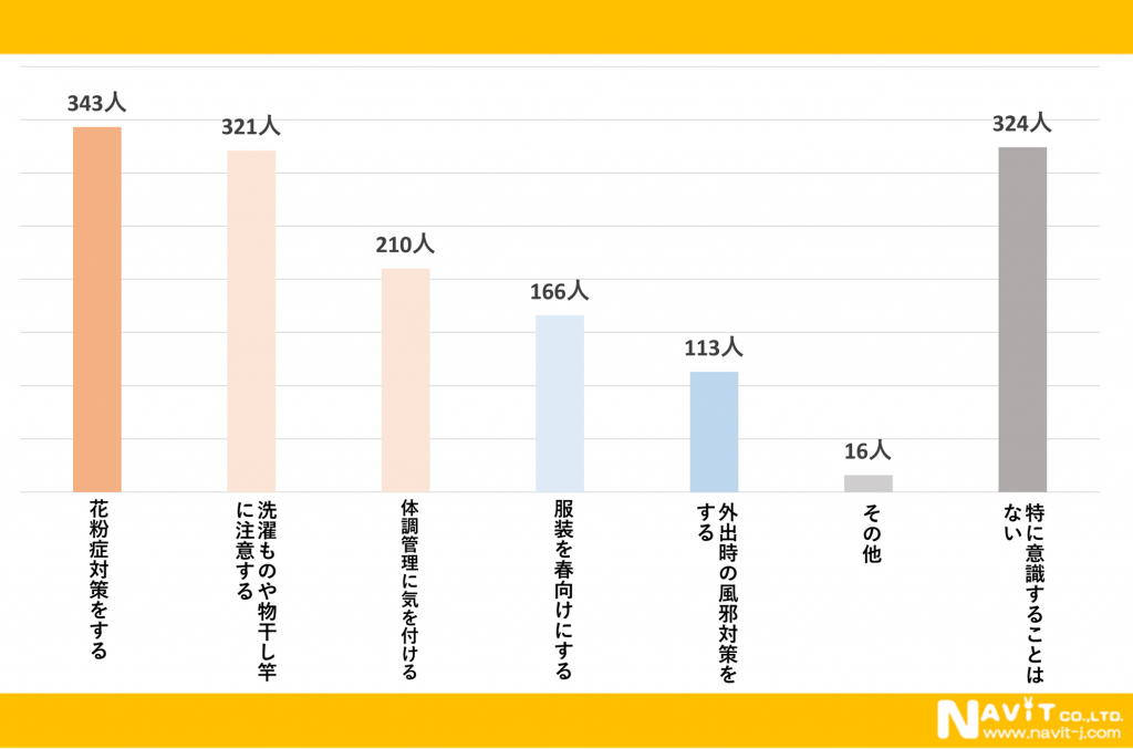 こちらのアンケートも複数回答にていただいております。春一番が吹いたときに生活面で意識することに対するアンケートでは、「花粉症対策を強化する」と回答した方が343人、「洗濯物や物干し竿に注意する」と回答した方が321人、「体調管理に気をつける」と回答した方が210人という結果になりました。