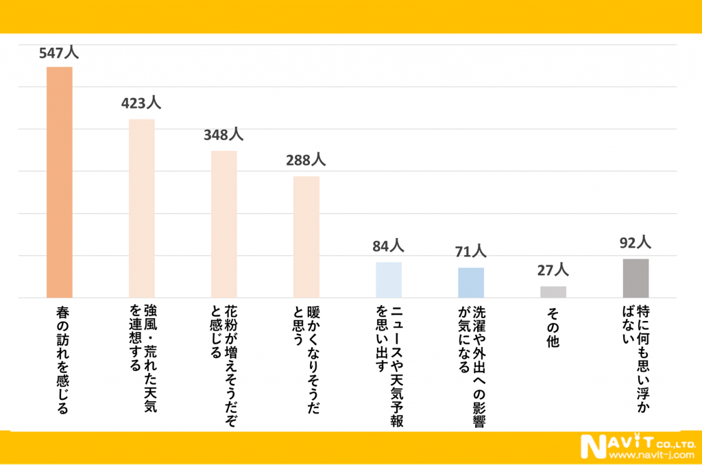 春一番が吹くと思い浮かぶことはありますか?というアンケートを複数回答にて実施したところ、「春の訪れを感じる」と回答した方が547人、「強風・荒れた天気を連想する」と回答した方が423人でした。また「花粉が増えそうだと感じる」と回答した方も348人いらっしゃいました。