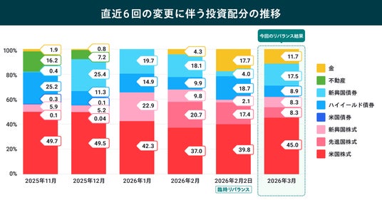※上記投資配分について、2025年11月は10月29日、2025年12月は12月1日、2026年1月は12月29日、2026年2月は1月29日、2026年3月は3月2日のそれぞれの変更時点の比率を示しています。2025年2月は、通常の変更に加えて2月2日に臨時リバランスを実施しました。