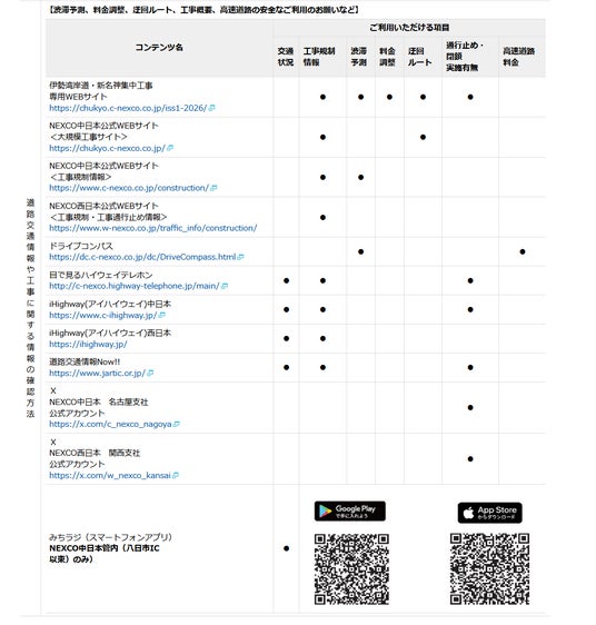 お出かけ前には渋滞予測や所要時間、迂回ルートのご案内や交通規制計画などの情報を伊勢湾岸道・新名神集中工事専用WEBサイトなどでご確認のうえ、余裕を持ってお出かけいただきますようお願いいたします。